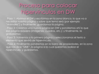 Este documento proporciona instrucciones sobre cómo agregar hipervínculos y videos a páginas web creadas en Dreamweaver (DW). Explica los pasos para crear páginas vinculadas entre sí mediante hipervínculos, construir páginas con marcos y agregar un video a una página HTML utilizando código.