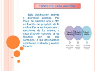 El documento discute diferentes tipos de evaluación educativa, incluyendo evaluación global vs parcial, inicial vs procesual vs final, interna vs externa, sumativa vs formativa. También describe que la evaluación debe permitir adaptar las actividades de aprendizaje a los estudiantes y comprobar si se están logrando las metas educativas.