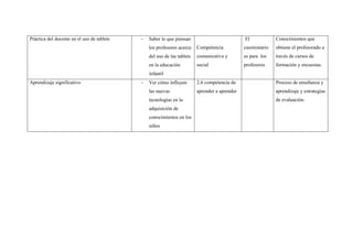 Este documento trata sobre el uso de tabletas en la educación infantil desde varias perspectivas. Primero, explora las concepciones y creencias de los profesores sobre el uso de tabletas, incluyendo cuestionarios para profesores. Segundo, analiza las aplicaciones disponibles y su idoneidad para el aprendizaje infantil. Tercero, examina cómo las nuevas tecnologías influyen en la adquisición de conocimientos en los niños.