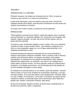 1) El documento presenta una introducción a la historia escrita por el historiador francés Marc Bloch mientras estaba encarcelado en un campo de concentración nazi en 1944. 2) Bloch define la historia como el estudio de los hombres a través del tiempo y argumenta que comprender el presente requiere entender el pasado. 3) Finalmente, advierte sobre la obsesión con los orígenes y argumenta que los fenómenos históricos deben explicarse en el contexto de su propio tiempo.