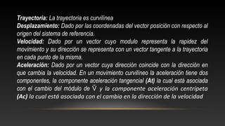 El movimiento curvilíneo se caracteriza por tener una trayectoria curva. La velocidad en cada punto está dada por un vector tangente a la trayectoria y cambia de dirección a lo largo de esta. La aceleración también es tangente a la trayectoria y está asociada con los cambios en la velocidad debido a fuerzas actuantes.