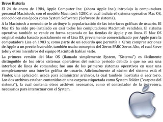 Mac OS, desarrollado por Apple para computadoras Macintosh, fue el primer sistema operativo con una interfaz gráfica accesible y popularizada en 1984. A lo largo de los años, Mac OS ha evolucionado, siendo notable por su facilidad de uso y resistencia a virus, aunque a menudo a un precio más alto que las PCs. La comparación entre Mac OS y Windows revela diferencias en estabilidad, disponibilidad y diseño, con ambos sistemas siendo funcionales pero con características únicas que atraen a diferentes tipos de usuarios.