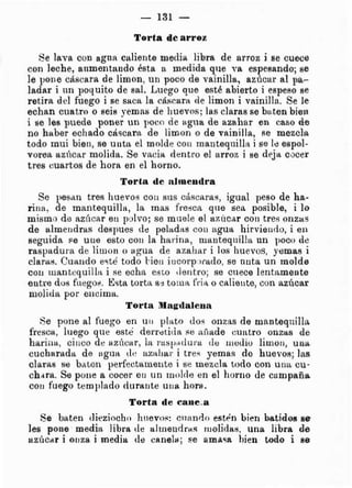 La torta de bizcocho se hace moliendo almendras dulces y amargas, mezclándolas con azúcar y yemas de huevo. Las claras de huevo se baten por separado y se añaden a la masa junto con cáscara de limón y nuez moscada. La mezcla se vierte en un molde untado con mantequilla y se hornea durante una hora. Para la torta de harina, se bate mantequilla, huevos y azúcar y se le agrega harina, untando previamente el molde con man