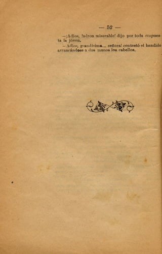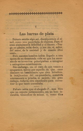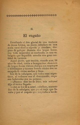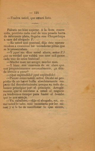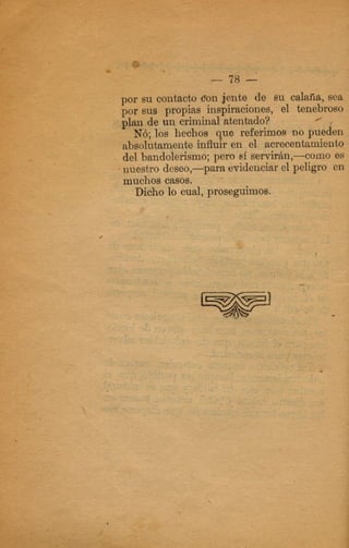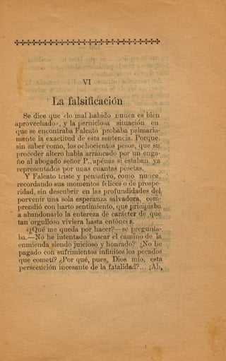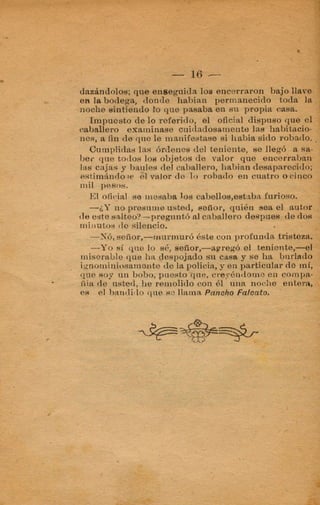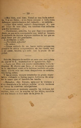 El documento narra los crímenes cometidos por el capitán Falcato y sus secuaces. Asaltaron la casa de un acaudalado hacendado, robando sus pertenencias. Más tarde, Falcato logra engañar a las autoridades haciéndose pasar por un comerciante para evadir la captura. Finalmente, es descubierta su identidad y continúa escapando de la justicia.
