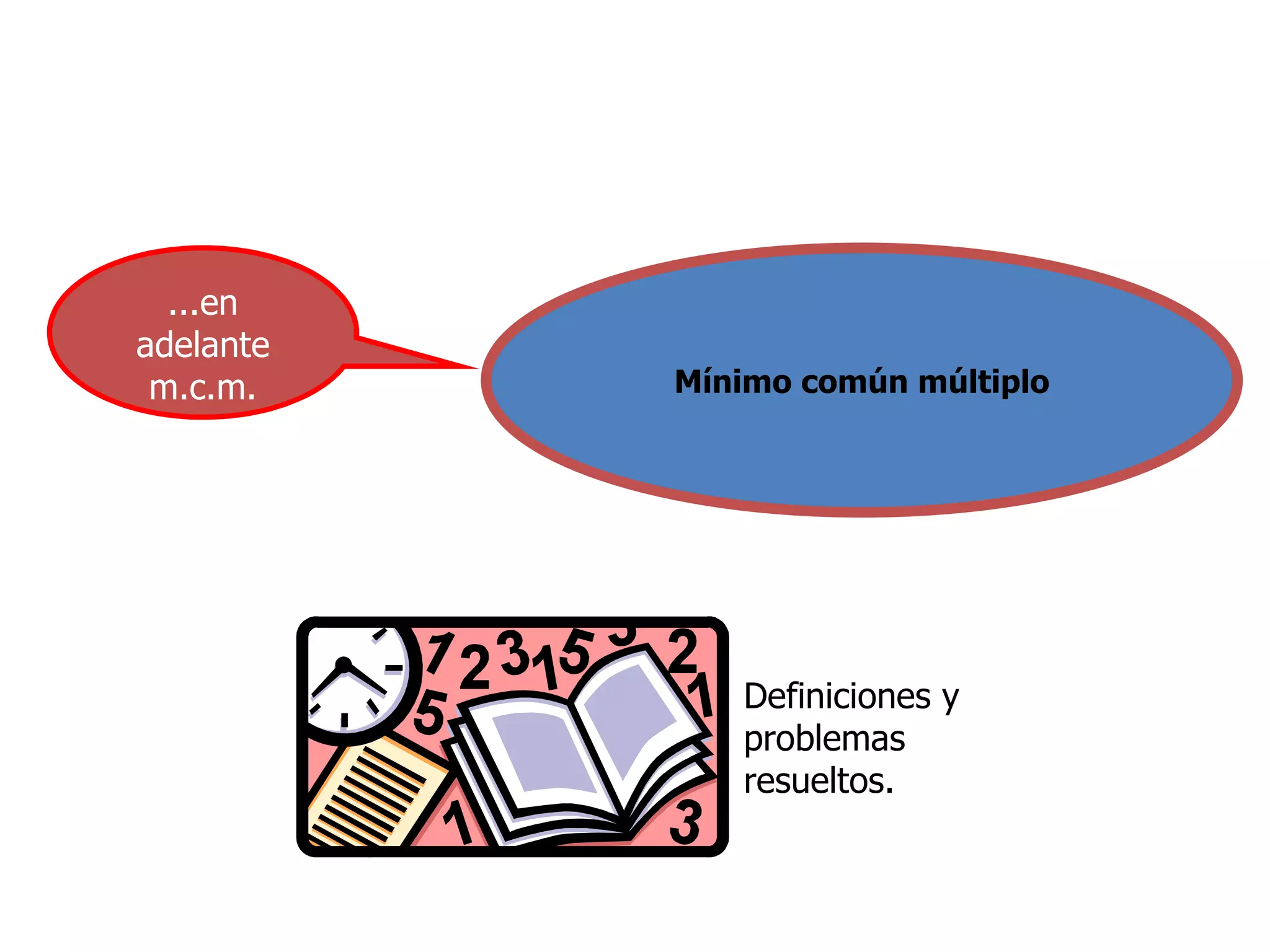El documento define el Máximo Común Divisor (MCD) y el Mínimo Común Múltiplo (MCM) de números y explica cómo calcularlos. Para el MCD, se descomponen los números en factores primos, se pasan a forma de potencia y se toman los factores comunes con el menor exponente. Para el MCM, se toman los factores comunes con el mayor exponente. A continuación, se resuelven algunos problemas como ejemplo.