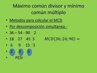 El documento presenta diferentes métodos para calcular el máximo común divisor (MCD) y mínimo común múltiplo (MCM) de números. Explica cómo usar la descomposición, el algoritmo de Euclides y las propiedades de los MCD y MCM para resolver problemas que involucran estos conceptos.