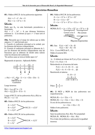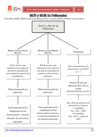 El documento trata sobre el máximo común divisor (MCD) y el mínimo común múltiplo (MCM) de polinomios. Explica que para calcular el MCD y MCM de polinomios se debe tener en cuenta el MCD y MCM de números enteros. A continuación, presenta las propiedades del MCD y MCM de polinomios y ofrece ejemplos resueltos de cómo calcular el MCD y MCM de diferentes polinomios.
