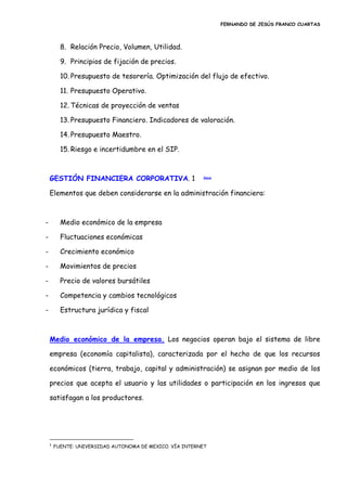 Este documento presenta un resumen del contenido temático y detallado de un curso de contabilidad gerencial. El contenido temático incluye análisis de entorno, diagnóstico corporativo, presupuestos, costos y riesgo económico y financiero. El contenido detallado cubre temas como fuerzas competitivas, estados financieros, costeo, precios, presupuestos y proyecciones. También describe diferentes métodos de análisis financiero como análisis horizontal, vertical y razones financieras.