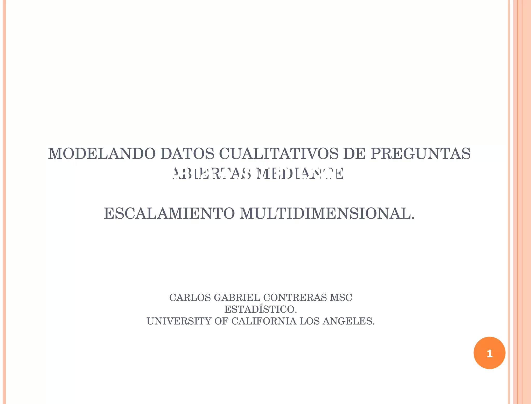 El documento detalla el uso del escalamiento multidimensional para modelar datos cualitativos de preguntas abiertas, con un enfoque en identificar la estructura mental del consumidor al responder sobre sus motivos para consumir un producto. Se propone un enfoque basado en la construcción de una base de datos binómica para codificar narraciones, la verificación de supuestos para asegurar la calidad de los datos, y la optimización del modelo para alcanzar un buen ajuste a las respuestas del consumidor. Las conclusiones resaltan la importancia de tres dimensiones clave que afectan la sensibilidad del consumidor al advocacy: sensibilidad a la recomendación, desempeño del producto y disposición a comprar.