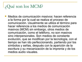 Los medios masivos de comunicación se refieren a formas como la radio, la televisión, los periódicos, internet y el cine que permiten transmitir información a grandes audiencias de manera rápida. Estos medios se caracterizan por su alcance global y capacidad de mantener a las personas conectadas, aunque también pueden manipular información. Algunos medios comunes son la radio, que no requiere imágenes; los periódicos, que presentan noticias de manera impresa; e internet, que permite a los usuarios publicar y acceder