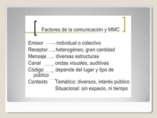 Los medios masivos de comunicación son canales artificiales que transmiten mensajes a una audiencia masiva. Modifican modos de vida y hábitos, son herramientas persuasivas en todo el mundo y contribuyen a formar opinión pública. Cada medio tiene ventajas y desventajas dependiendo de su rapidez, alcance, capacidad multimedia y facilidad de acceso a la información.
