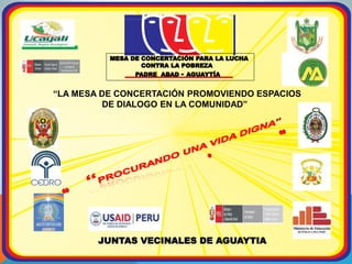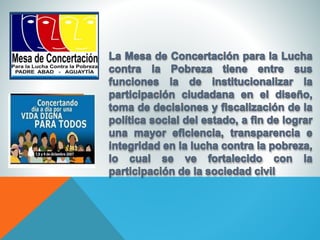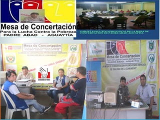 La Mesa de Concertación promueve el diálogo entre diferentes actores de la comunidad para resolver problemas. Organizó reuniones entre dirigentes de agricultores de coca, autoridades y otros grupos para llegar a acuerdos pacíficos sobre la erradicación de coca. También impulsó el diálogo entre el gobierno y manifestantes sobre el problema del gas. Supervisa programas sociales y realiza actividades cívicas para mejorar la educación y alimentación en la región.