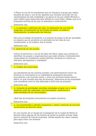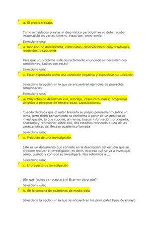 El documento presenta una serie de preguntas sobre diversos temas relacionados con estudios de casos, proyectos comunitarios, ensayos académicos y exámenes de grado. Incluye preguntas sobre las características, fases y tipos de estos temas, así como sobre plazos y consideraciones para diferentes modalidades de titulación.