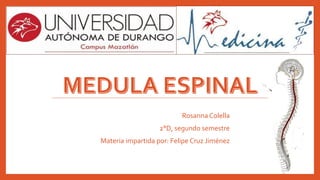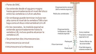 El documento describe la anatomía y el funcionamiento de la médula espinal, incluyendo sus distintas partes, la vascularización y los nervios espinales. Detalla la disposición de las estructuras en el conducto vertebral y menciona las meninges que protegen al sistema nervioso central. Además, se aborda el proceso de punción lumbar y la recolección de líquido cefalorraquídeo.