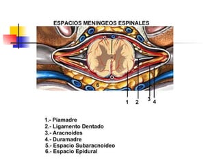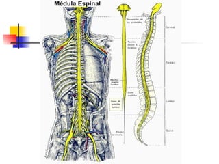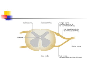 La médula espinal es una parte del sistema nervioso central que se encuentra dentro del canal raquídeo. Mide aproximadamente 45 cm de largo y conduce la corriente nerviosa entre el cerebro y el cuerpo. Está compuesta de sustancia gris en el centro en forma de H y sustancia blanca alrededor. La sustancia gris contiene núcleos sensitivos, motores y vegetativos, mientras que la sustancia blanca contiene tres cordones que transportan señales ascendentes y descendentes.