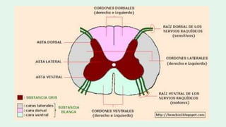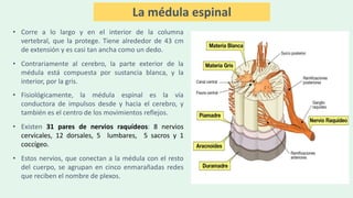 La médula espinal conduce impulsos entre el cerebro y el resto del cuerpo, y es el centro de los movimientos reflejos. Está protegida por la columna vertebral y mide aproximadamente 43 cm de largo. Exteriormente contiene sustancia blanca, mientras que interiormente contiene sustancia gris. Posee 31 pares de nervios raquídeos que se conectan con diferentes partes del cuerpo.