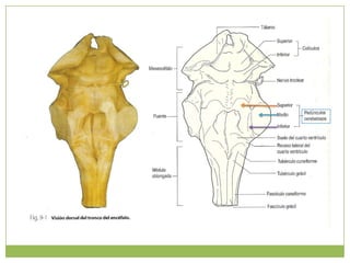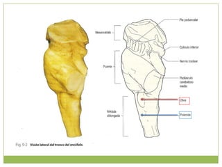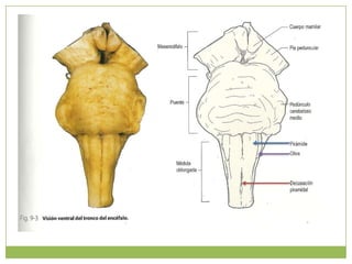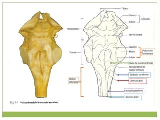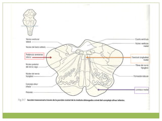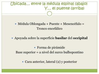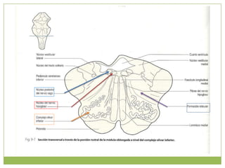 Este documento resume la anatomía de la médula oblongada. Describe su ubicación entre la médula espinal y el puente, y su configuración externa e interna. Detalla las estructuras que la componen como los tractos piramidales, olivares, solitarios y vestibulares, así como los núcleos gráciles, cuneiformes y del hipogloso. Explica las conexiones y funciones de estas estructuras en el control motor y sensorial.