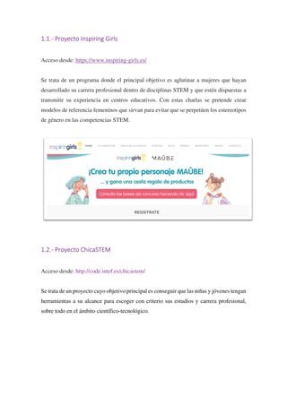 El documento describe varias iniciativas para fomentar las vocaciones científicas entre las niñas, incluyendo programas como Inspiring Girls, ChicaSTEM y el CSIC en la Escuela, así como el Día Internacional de la Mujer y la Niña en la Ciencia. También recomienda recursos educativos como juegos y libros para motivar a las niñas a estudiar carreras científicas.