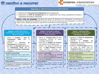 Este documento presenta los módulos de un diplomado sobre arquitectura de competencias. El módulo 1 se enfoca en identificar tipos de competencias y estructurar niveles, grupos y alcance. El módulo 2 trata sobre realizar análisis funcionales de áreas seleccionadas. El módulo 3 cubre la identificación y descripción de competencias individuales y perfiles. El trabajo final incluye la estructura de competencias de una organización y definiciones de perfiles validadas.