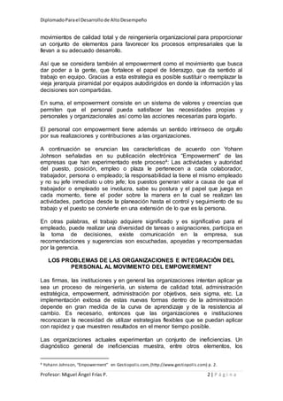 El documento define el concepto de empowerment como dar poder y autoridad a los subordinados para que se sientan dueños de su trabajo. Explica que implica delegar responsabilidades y tomar decisiones sin necesidad de aprobación, manteniendo informados e involucrando a los empleados. También describe problemas comunes en las organizaciones como la falta de motivación y compromiso del personal, y cómo el empowerment busca resolverlos transfiriendo autoridad a través de la capacitación y el trabajo en equipo.
