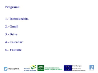 El documento presenta las principales herramientas de Google, comenzando con una breve introducción sobre los fundadores de Google y el inicio de la empresa en 2000. Luego describe Gmail, el servicio de correo electrónico lanzado en 2004 que ofrece gran capacidad de almacenamiento gratuito y funciones como filtros de mensajes y etiquetas. También cubre Drive, el servicio de almacenamiento en la nube, y Calendar, el calendario en línea.
