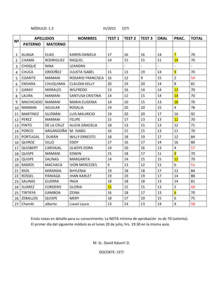Este documento presenta las notas de 27 estudiantes en un módulo de capacitación. Incluye los resultados de los estudiantes en 4 exámenes y una práctica, así como su nota total. La nota mínima para aprobar es 70. El primer día del siguiente módulo será el 20 de julio a las 19:30 en la misma aula.