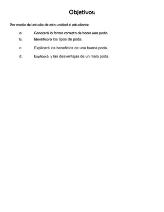 Este documento presenta información sobre la poda de árboles y arbustos. Explica los objetivos y beneficios de una buena poda, así como los tipos de poda y las herramientas utilizadas. Detalla cómo realizar cortes correctos y las épocas apropiadas para podar diferentes especies. El documento provee definiciones clave y preguntas de práctica para evaluar la comprensión del estudiante sobre los conceptos fundamentales de la poda.