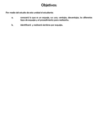 Este documento presenta información sobre la propagación de plantas por esquejes. Explica que un esqueje es un fragmento de planta que puede enraizar para formar una nueva planta genéticamente idéntica a la planta original. Detalla cuatro tipos principales de esquejes y ofrece ejemplos de plantas que se pueden propagar de cada tipo. Además, discute las ventajas de la propagación por esquejes, como asegurar resultados deseados y acelerar el desarrollo de plantas, así como las posibles desventajas, como la
