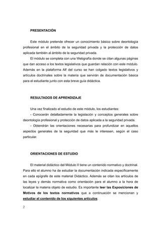 Este documento presenta el Módulo II de un curso de experto en dirección de seguridad privada sobre deontología profesional y protección de datos. El módulo explica los conceptos básicos de deontología profesional y protección de datos aplicados al ámbito de la seguridad privada, así como la normativa relevante. También incluye ejercicios de autoevaluación para los estudiantes.