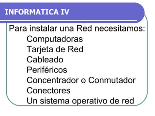 Para instalar una red se necesitan computadoras con tarjetas de red, cableado, concentradores o conmutadores, conectores y un sistema operativo de red. Las tarjetas de red permiten conectar las computadoras al cableado e incluyen un código de solicitud de interrupción. Los concentradores envían la información a todas las computadoras conectadas, mientras que los conmutadores solo envían a la computadora de destino. El cableado incluye cables par trenzado y coaxial.