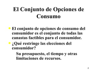 El documento explica la restricción presupuestaria del consumidor. 1) La restricción presupuestaria representa el conjunto de canastas de bienes factibles dado el ingreso y precios del consumidor. 2) Cambios en precios o ingreso afectan el conjunto presupuestario y la restricción presupuestaria. 3) Impuestos uniformes equivalen a una reducción del ingreso, mientras que impuestos selectivos cambian la pendiente de la restricción presupuestaria.