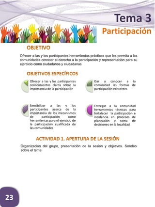 Este documento ofrece herramientas para fortalecer la participación ciudadana en las comunidades. Explica diferentes formas de participación como los mecanismos de participación establecidos en la constitución como iniciativa popular, cabildo abierto, consulta popular y revocatoria de mandato. También define conceptos clave relacionados con la participación ciudadana y comunitaria.