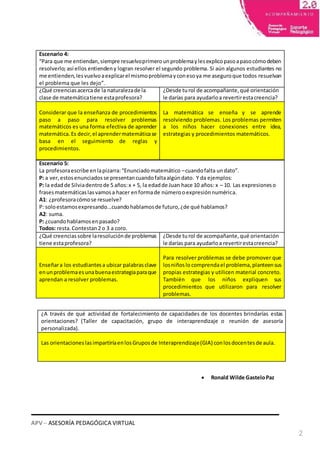 Este documento presenta 5 escenarios que describen situaciones en clases de matemáticas. Para cada escenario, se identifican las creencias del docente sobre la enseñanza de las matemáticas y la motivación de los estudiantes. Se proponen orientaciones para ayudar a los docentes a mejorar sus prácticas desde el rol de acompañamiento, como promover el uso del juego como estrategia de aprendizaje y enfocarse en la resolución de problemas. Las orientaciones se impartirían en Grupos de Interaprendizaje para fortalecer las capac
