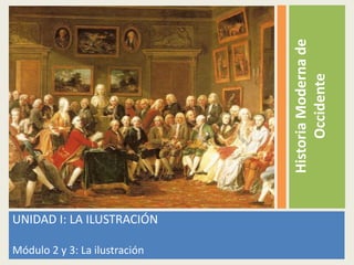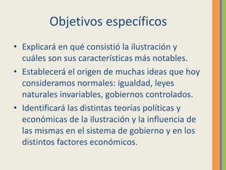 Este documento resume los objetivos, características y pensadores clave de la Ilustración. La Ilustración se caracterizó por su racionalismo y laicismo, y estableció ideas como la igualdad y leyes naturales. Filósofos como Locke y Montesquieu influyeron en las teorías políticas de la época, mientras que Adam Smith ayudó a desarrollar las ideas económicas liberales.
