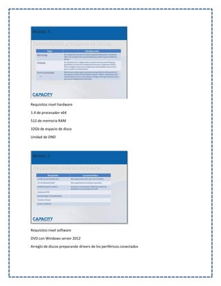 El documento describe los pasos para instalar Windows Server 2012 por primera vez de forma física o virtual, incluyendo una explicación de los arreglos de discos (RAID), sus características principales como mirroring, striping y corrección de errores, y los requisitos de hardware y software necesarios que incluyen un procesador x64 de 1.4GHz, 512GB de RAM, 32GB de espacio en disco y un DVD con Windows Server 2012.