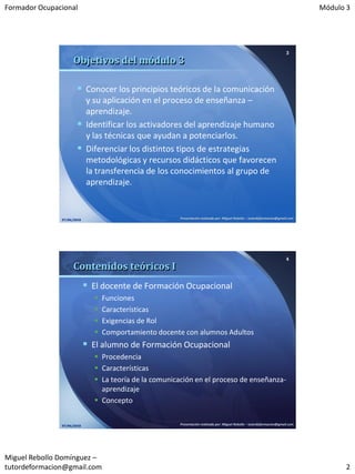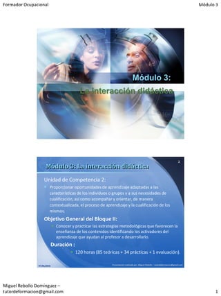 Este documento presenta el Módulo 3 de un curso de Formador Ocupacional. El módulo se centra en la interacción didáctica y cubre temas como la comunicación en el aprendizaje, los activadores del aprendizaje, las estrategias metodológicas y el uso de recursos didácticos. El módulo consta de contenidos teóricos y prácticos, incluidas simulaciones docentes y ejercicios para analizar y mejorar las habilidades de enseñanza.