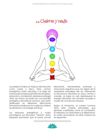 El documento describe los chakras y nadis según la filosofía hindú. Explica que los chakras son centros de energía ubicados a lo largo de la espina dorsal que permiten el flujo de la energía vital (prana). También describe los siete chakras principales y sus funciones. Además, señala que los nadis son canales energéticos que conectan los chakras y por los cuales fluye el prana, mencionando los tres nadis principales: ida, pingala y sushuma.
