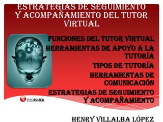 El tutor virtual es fundamental en el proceso formativo, responsable de guiar y supervisar a los estudiantes en su aprendizaje, mientras utiliza diversas herramientas de comunicación y apoyo como Moodle, chat y correo interno. Las funciones del tutor incluyen aspectos académicos, organizativos, orientadores y sociales, además de implementar estrategias de seguimiento para promover la individualización y la equidad en la tutoría. Existen distintos tipos de tutoría, entre ellas la individual y grupal, cada una adaptándose a las necesidades de los estudiantes y fomentando su participación activa.