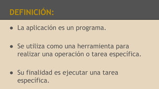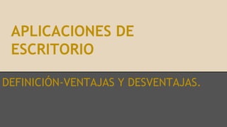 Este documento define y compara las aplicaciones de escritorio y las aplicaciones web. Las aplicaciones de escritorio son programas que se ejecutan localmente en una computadora para realizar tareas específicas, mientras que las aplicaciones web se ejecutan a través de un navegador web desde cualquier dispositivo con acceso a Internet. Las aplicaciones de escritorio tienen ventajas como mayor interactividad, pero dependen del sistema operativo local, mientras que las aplicaciones web pueden actualizarse automáticamente y funcionan en cualquier plataforma a través de un nave