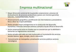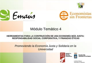 El documento aborda la importancia de la responsabilidad social corporativa y las finanzas éticas para construir una economía justa, enfatizando el papel del sector privado en el desarrollo económico y la provisión de servicios sociales. Se discuten las violaciones de derechos humanos y el impacto ambiental causado por las multinacionales, así como el papel de la banca ética y las inversiones socialmente responsables. Finalmente, se plantean criterios y prácticas para que las empresas actúen de manera sostenible y responsable.