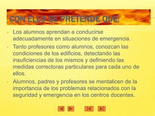 Este documento presenta el plan de emergencia y evacuación de un centro educativo. El plan busca enseñar a alumnos y profesores a comportarse adecuadamente durante emergencias y conocer las condiciones de los edificios. Detalla las instrucciones para alumnos y profesores, incluyendo que los alumnos sigan las indicaciones de sus profesores, que los profesores se hagan cargo de sus grupos y el orden de evacuación por plantas empezando por la planta baja.