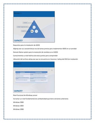 Un controlador de dominio (DC) es el centro de autenticación de un dominio Windows. Proporciona servicios de directorio como Active Directory que almacenan información de usuarios, grupos, computadoras y otros recursos de red en una base de datos centralizada. La instalación de Active Directory Domain Services (AD DS) requiere ejecutar Adprep.exe y DCPROMO para promover un servidor como controlador de dominio, estableciendo su nivel funcional.