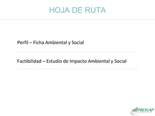 El documento proporciona información sobre la preparación de proyectos de inversión pública para el PROSAP (Programa de Saneamiento de Aguas y Saneamiento de la Provincia de Buenos Aires). Explica los requisitos para completar el Perfil del proyecto, incluida la Ficha Ambiental y Social. También describe los posibles estudios ambientales y sociales necesarios como la Evaluación de Impacto Ambiental y Social para proyectos Clase A y B, y provee detalles sobre su alcance e implementación.