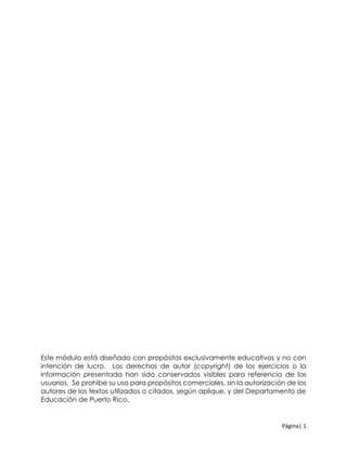 Este documento presenta un módulo didáctico de matemáticas para sexto grado. Incluye 16 lecciones organizadas en dos unidades sobre números y operaciones. Cada lección contiene objetivos, contenido, ejercicios de práctica y recursos en internet. El módulo está diseñado para que los estudiantes, maestros y familias lo utilicen durante 10 semanas siguiendo un calendario de progreso. El propósito es apoyar el aprendizaje matemático de forma independiente.