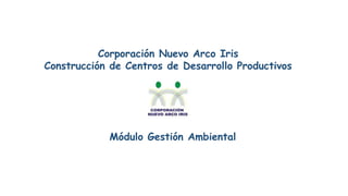 Este documento presenta el módulo de gestión ambiental de la Corporación Nuevo Arco Iris para la construcción de centros de desarrollo productivos. El módulo consta de 7 temas que abordan conceptos como economía circular, identificación de impactos ambientales, estrategias de reducción de impactos y la importancia de los planes de manejo ambiental. El objetivo es que los participantes reconozcan los impactos ambientales generados por sus unidades productivas y adopten estrategias para optimizar recursos y minimizar desechos de una manera sostenible.