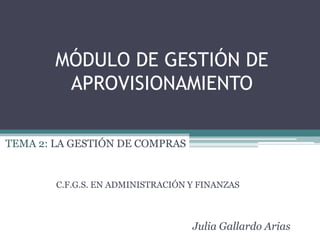 Este documento trata sobre la gestión de compras. Explica que la gestión de aprovisionamiento incluye la gestión de compras, el almacenamiento y los stocks mínimos. Su función es adquirir materiales de manera eficiente y al menor coste para contribuir a los objetivos de la empresa. También debe coordinarse con otros departamentos como producción y comercial.