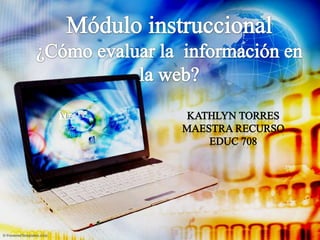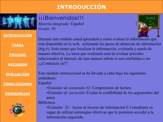 Este documento presenta un módulo de instrucción para enseñar a estudiantes de 10mo grado cómo evaluar la información en Internet utilizando los pasos del modelo Big 6. Los estudiantes aprenderán a identificar el autor, editor, audiencia, punto de vista, fecha de actualización y referencias de artículos en línea. Luego evaluarán dos artículos sobre Internet usando una rúbrica para determinar la credibilidad de cada fuente.