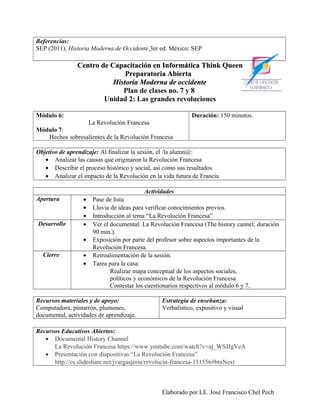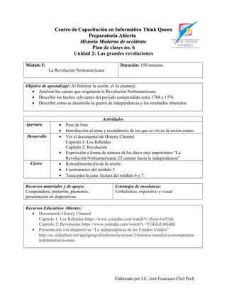 Este documento presenta el plan de estudios de dos módulos sobre la Revolución Americana. Los objetivos son analizar las causas y hechos clave de 1768-1776, así como el desarrollo de la guerra de independencia y sus resultados. Las actividades incluyen ver documentales, exposiciones y tareas.