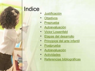 Este documento describe las teorías de Viktor Lowenfeld sobre las etapas del desarrollo artístico infantil. Lowenfeld identificó cinco etapas: garabato, pre-esquemática, esquemática, realismo y seudonaturalismo. También describe los principios del arte infantil, como la aplicación múltiple y la visión de rayos X. El documento incluye ejemplos de dibujos típicos de cada etapa y actividades para que los estudiantes apliquen estas teorías.