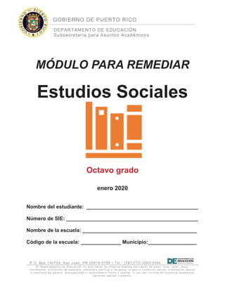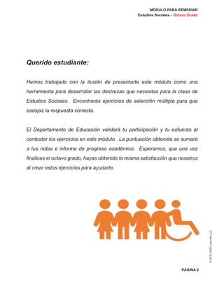 Este documento presenta un módulo de estudios sociales para estudiantes de octavo grado. El módulo incluye ejercicios de selección múltiple para ayudar a los estudiantes a desarrollar habilidades en esta materia. También presenta información sobre el régimen colonial español en América y el desarrollo de las 13 colonias originales de los Estados Unidos.